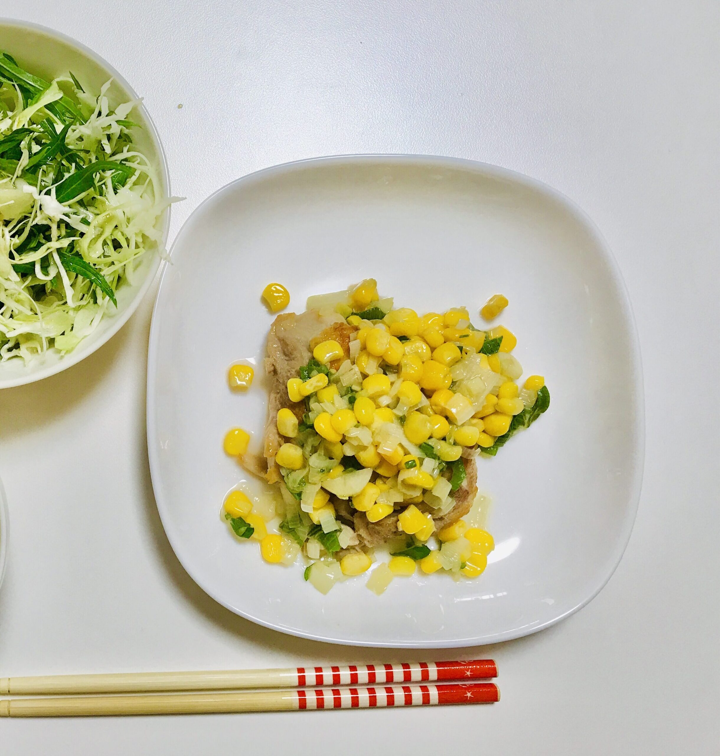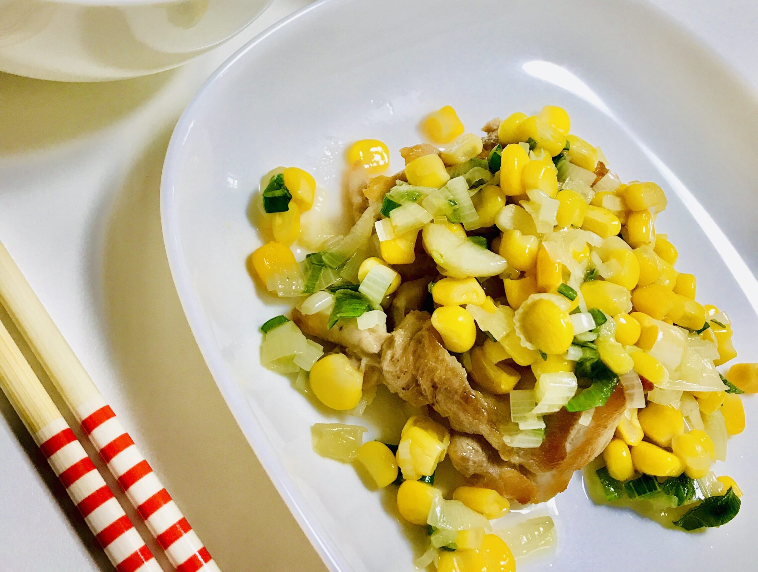 チキンステーキにかけた、ネギ塩コーンは、他のレシピにも応用可能だと思います。