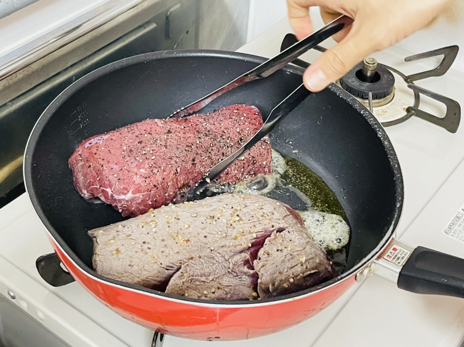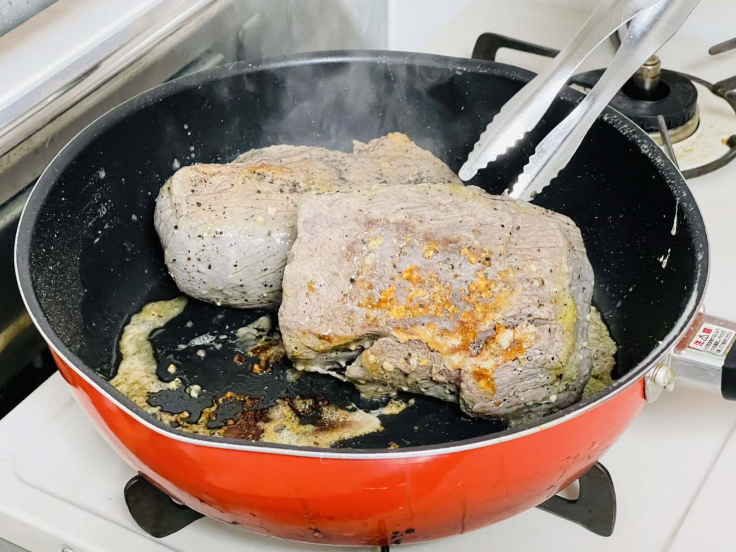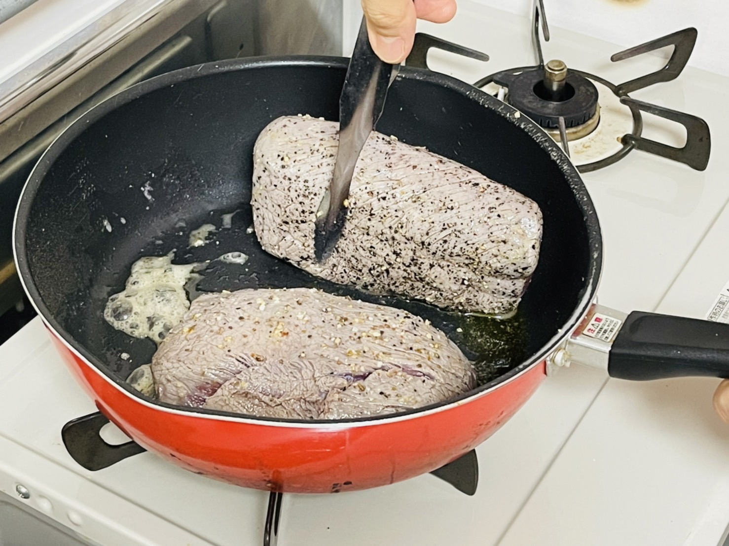 ④裏返して蒸し焼きする:ローストビーフの作り方