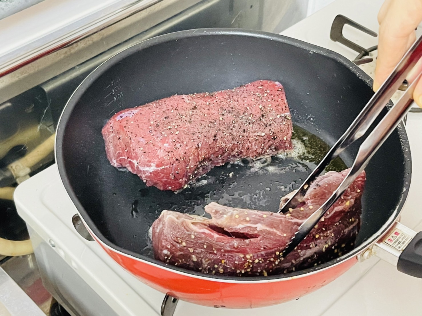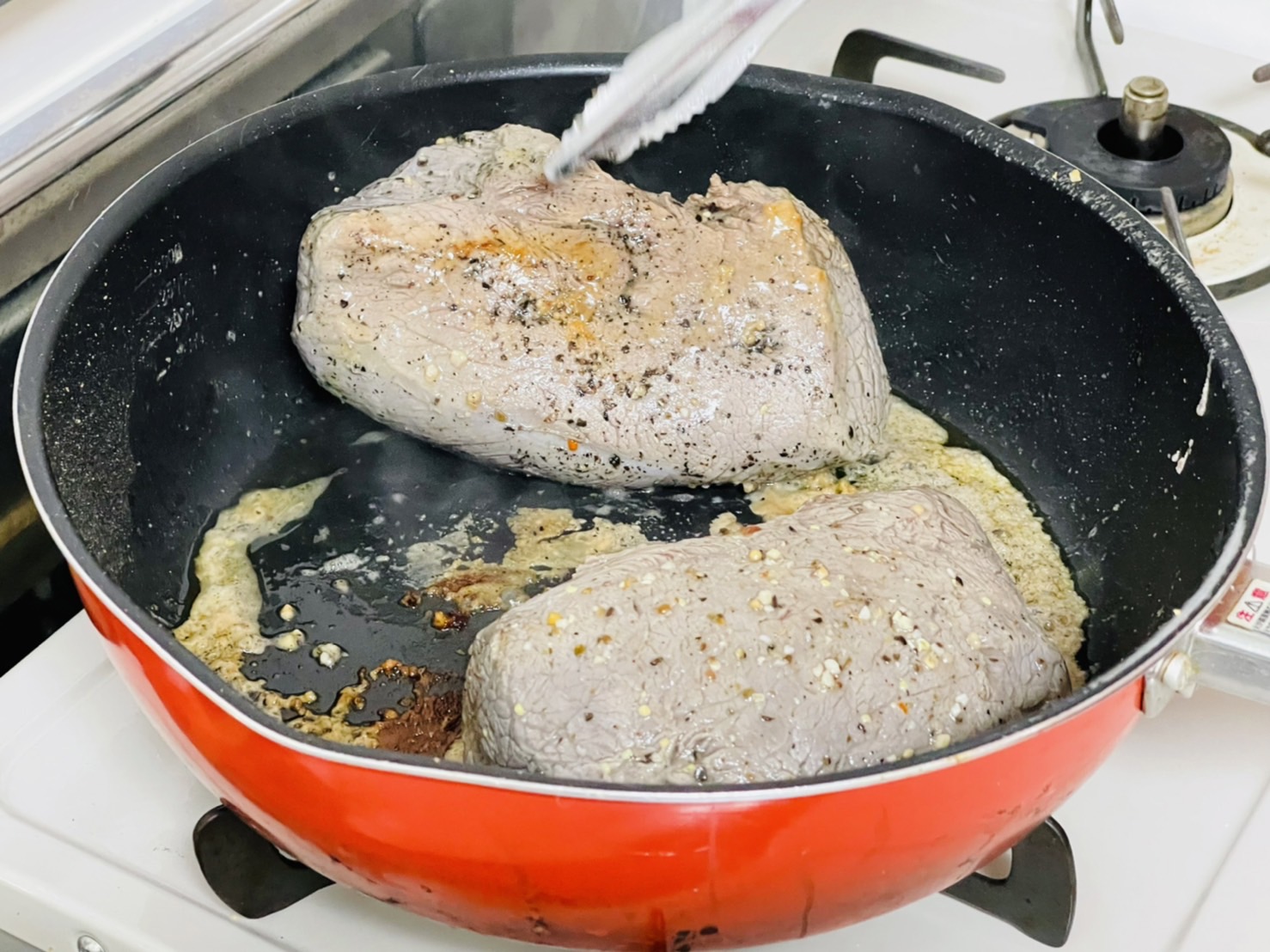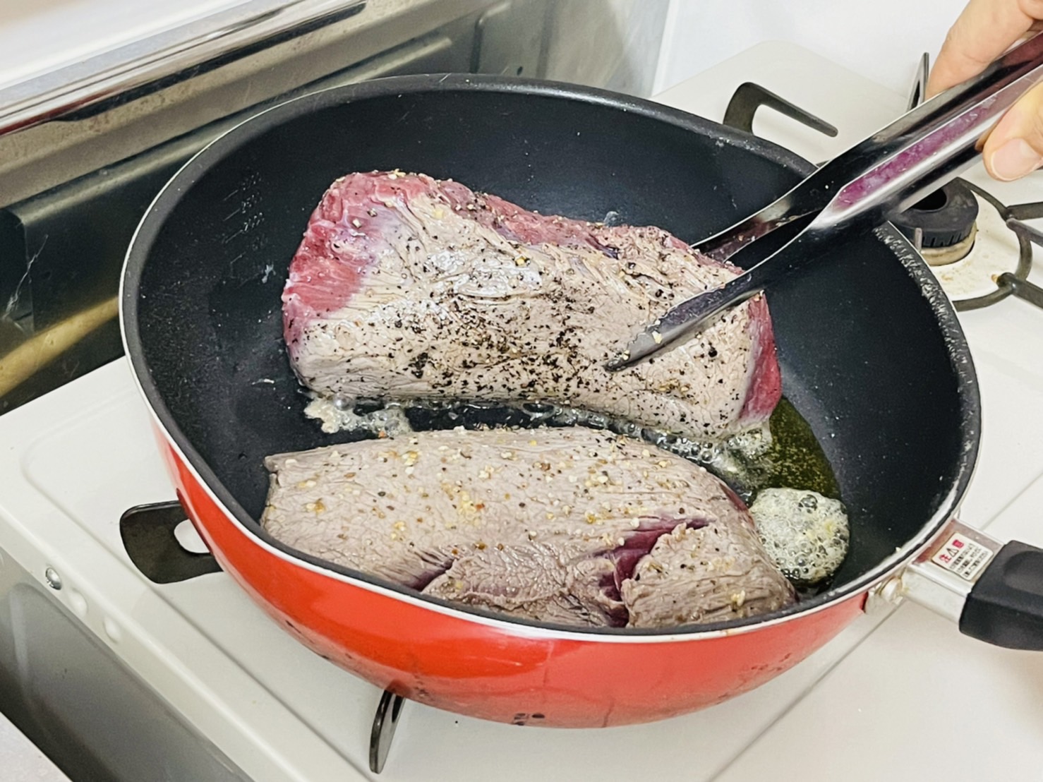 ④裏返して蒸し焼きする:ローストビーフの作り方