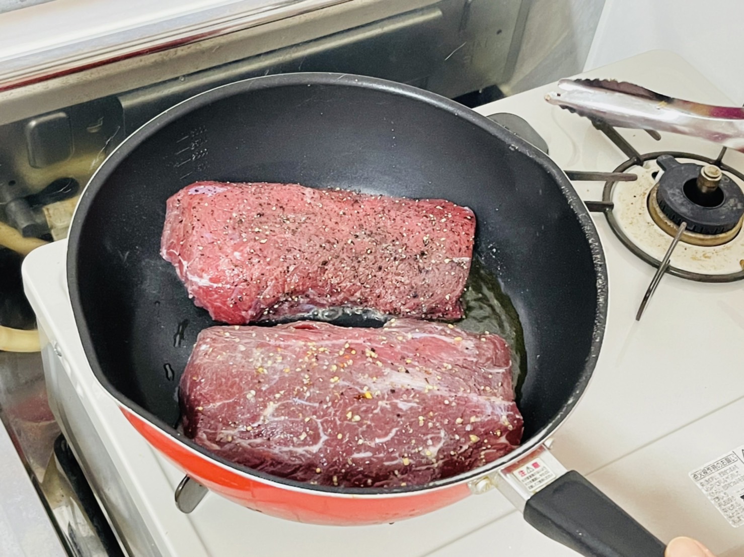 フライパンに油をひき、中~強火でお肉の全体に焼き目を付けます。
