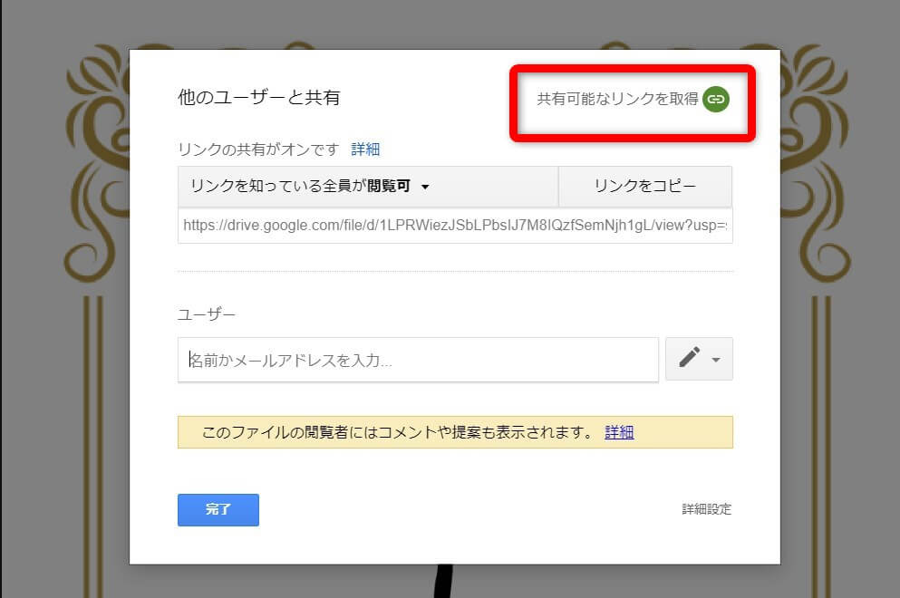 まず、共有ボタンを押し、共有可能なリンクを取得しますを押します。
