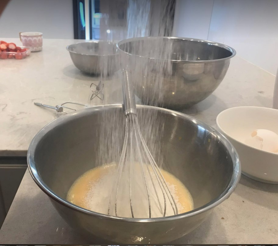 卵と牛乳が混ざったら、粉類を振るい入れます。