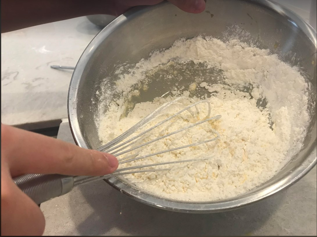 泡立て器で粉っ気がなくなるまで混ぜます。